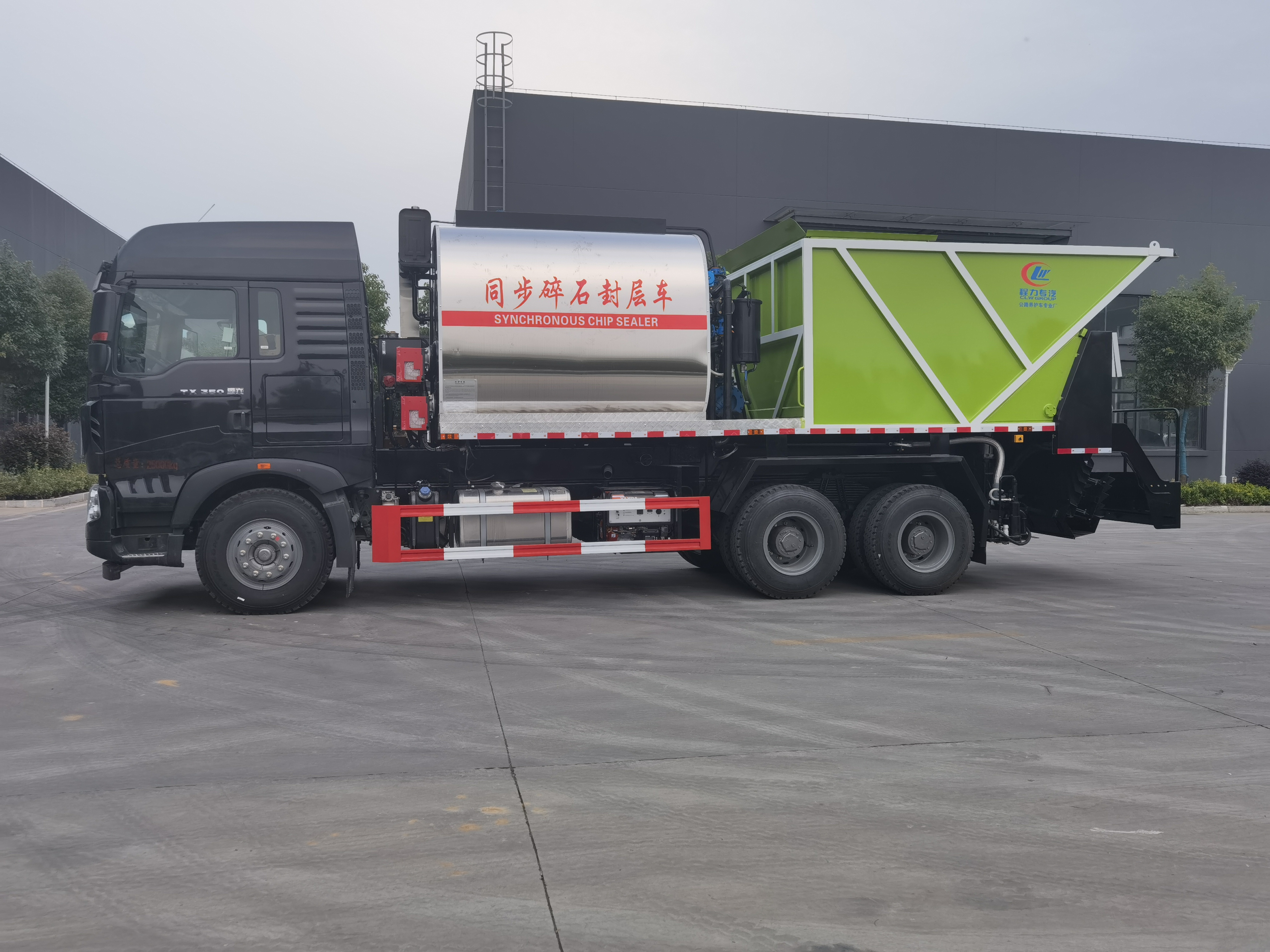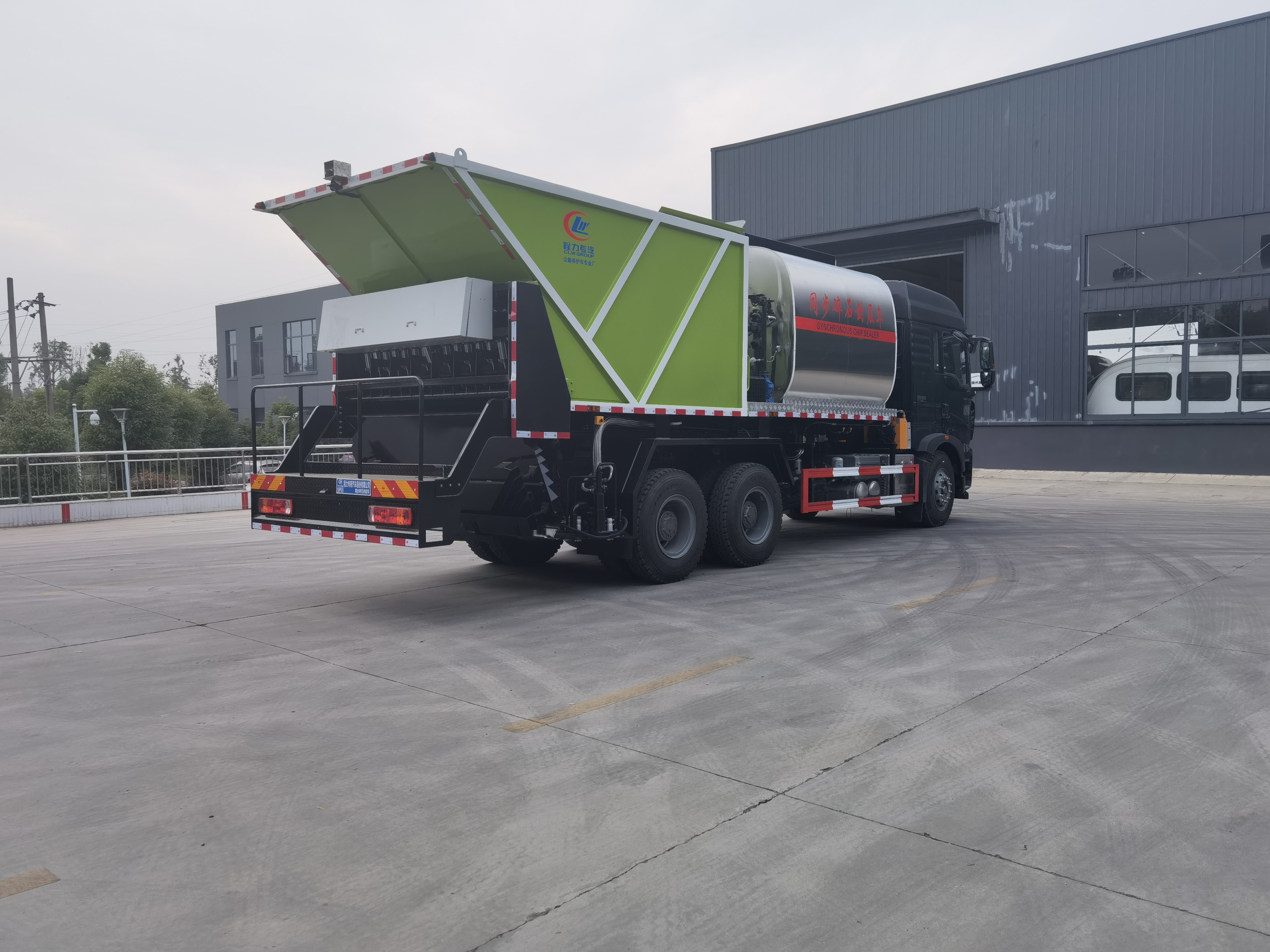 主要參數 CLW5253TFCZ6型同步碎石是由我公司自行研制開發設計,具有自主知識產權的同步碎石封層車。達到了機、電、液合一化操作,設備操作工序得到簡化,操作簡單,整機技術性已達到世界先進水平。整機性能參數產品型號: CLW5253TFCZ6總 質 量:25000kg整備質量:17100kg外形尺寸:10240×2550×3710mm瀝 青 罐:8m³石 料 倉:12m³撒布寬度:4000mm噴嘴間距:125mm瀝青撒布量:0.2~1.5kg/m2石料規格 :S3~S24mm加熱方式:利雅路柴油燃燒器+導熱油自動升溫噴灑介質:熱瀝青、SBS改性瀝青、乳化瀝青、改性乳瀝青。撒布誤差:±1.5%。