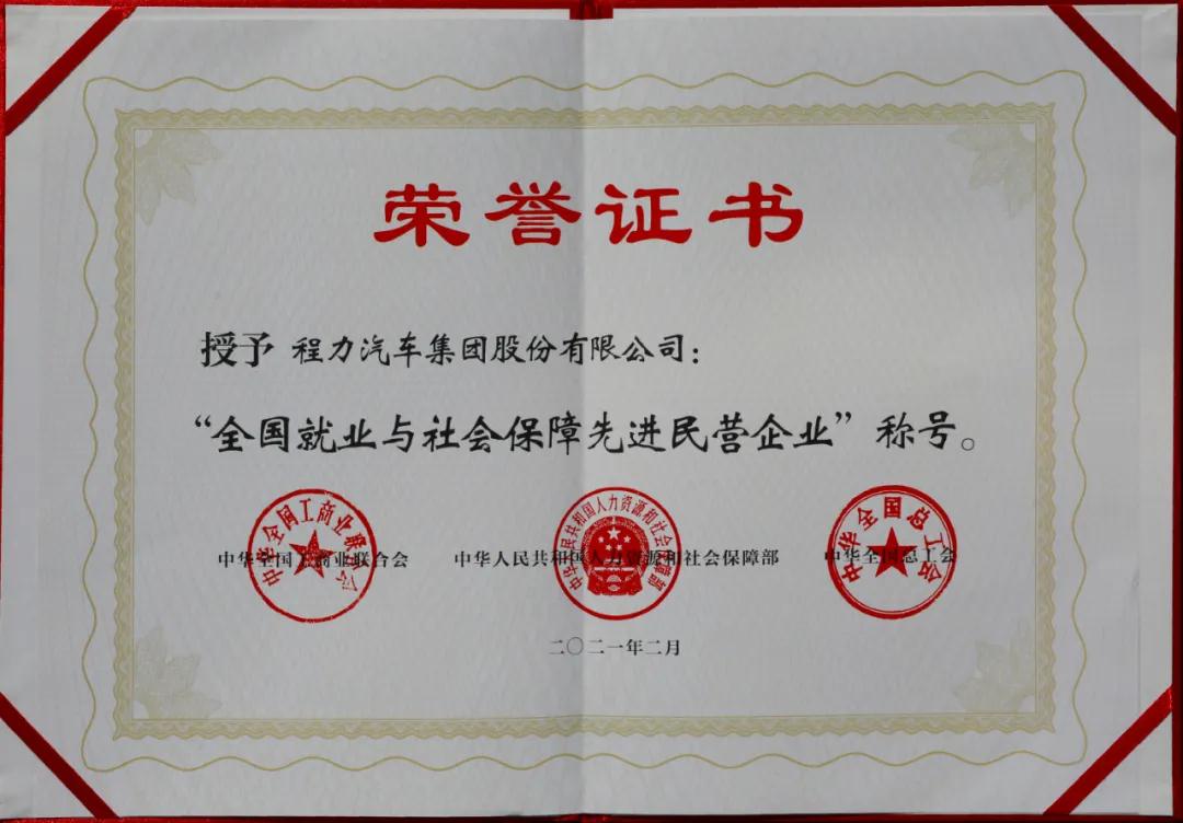 3月2日,程力汽車集團股份有限公司收到國家人力資源和社會保障部、中華全國工商業(yè)聯(lián)合會、中華全國總工會聯(lián)合頒發(fā)的“全國就業(yè)與社會保障先進民營企業(yè)”榮譽證書及牌匾,這是程力汽車集團股份有限公司在2021年初被授予的開門紅全國性殊榮,也是程力集團繼2020年連續(xù)三次受到全國性榮譽表彰。